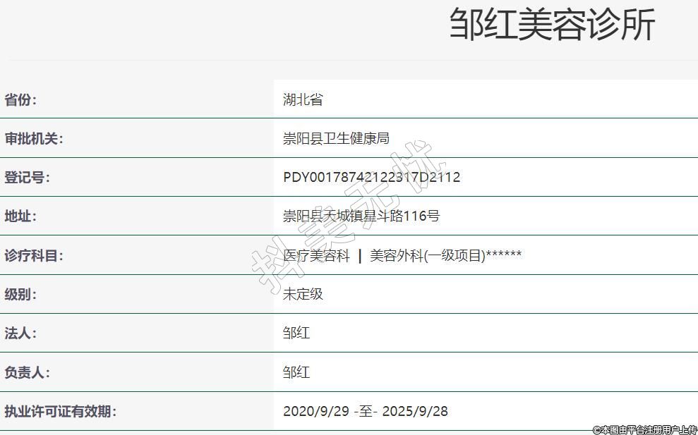咸宁邹红美容2015年10月20日成立,地址:崇阳县天城镇星斗路116号,诊疗科目:医疗美容科 | 美容外科(一级项目)******