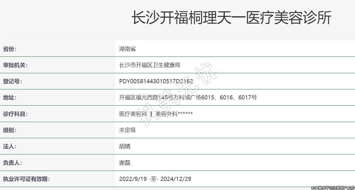 长沙桐理天一医疗美容2022年07月13日成立,地址:开福区福元西路148号万科城广场6015、6016、6017号,诊疗科目:医疗美容科 | 美容外科******