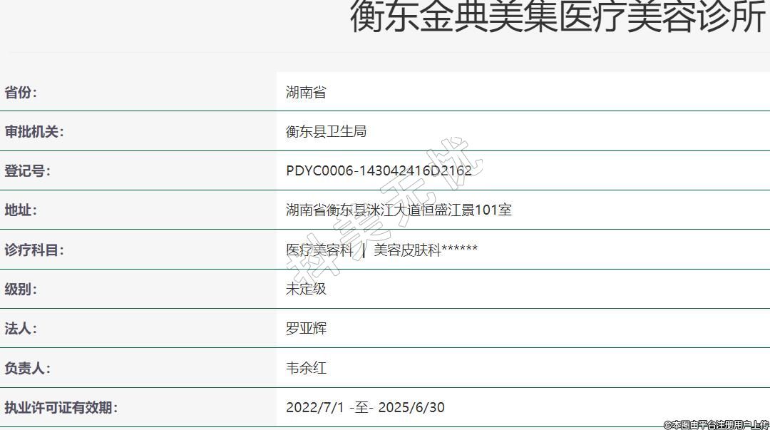 衡东金典美集医疗美容2019年04月30日成立,地址:湖南省衡东县洣江大道恒盛江景101室,诊疗科目:医疗美容科 | 美容皮肤科******