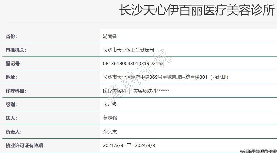 长沙伊百丽医疗美容(天心)2014年03月11日成立,地址:长沙市天心区湘府中路369号星城荣域园综合楼301(西北侧),诊疗科目:医疗美容科 | 美容皮肤科******
