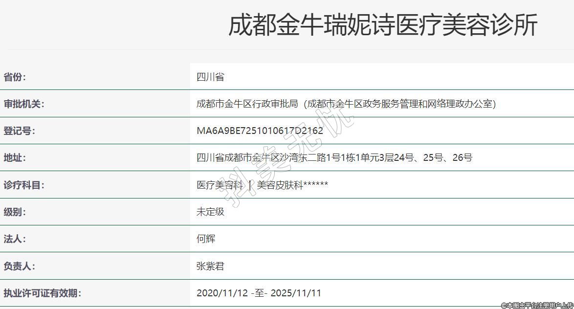 成都金牛瑞妮诗医疗美容诊所有限公司成立于2020年11月10日,门诊位置位于四川省成都市金牛区沙湾东二路1号1栋1单元3层24号、25号、26号。