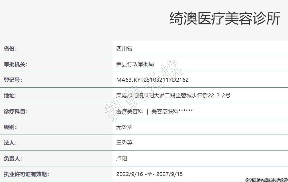 自贡绮澳医疗美容2020年03月20日成立,地址:荣县旭阳镇旭阳大道二段金碧城步行街22-2-2号,诊疗科目:医疗美容科 | 美容皮肤科******