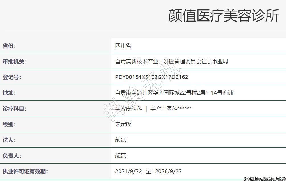 自贡颜值医疗美容2021年03月25日,地址:自贡市自流井区华商国际城22号楼2层1-14号商铺,诊疗科目:美容皮肤科 | 美容中医科******