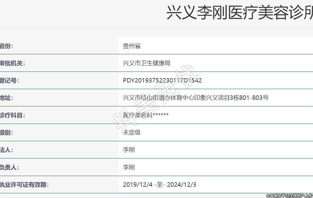 兴义李刚医疗美容地址:兴义市桔山街道办体育中心印象兴义项目3栋801-803号,诊疗科目:医疗美容科******