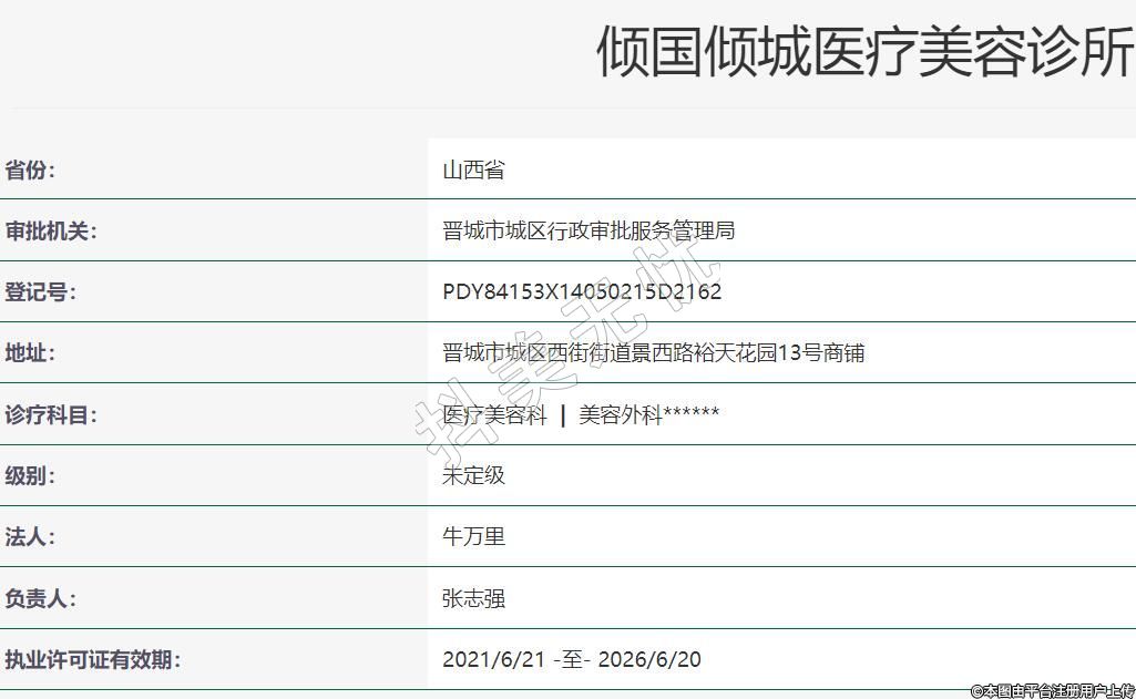 晋城倾国倾城医疗美容2021-05-11成立,地址:晋城市城区西街街道景西路裕天花园13号商铺,诊疗科目:医疗美容科 | 美容外科******