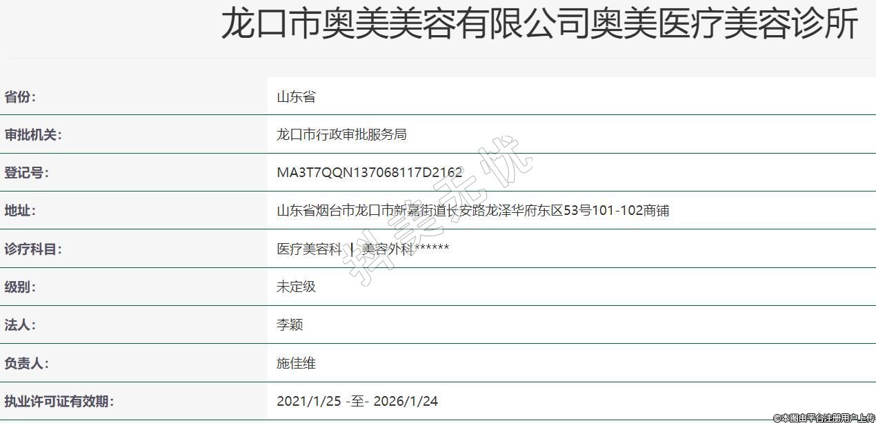 龙口奥美医疗美容2020-06-05成立,地址:山东省烟台市龙口市新嘉街道长安路龙泽华府东区53号101-102商铺,诊疗科目:医疗美容科 | 美容外科******
