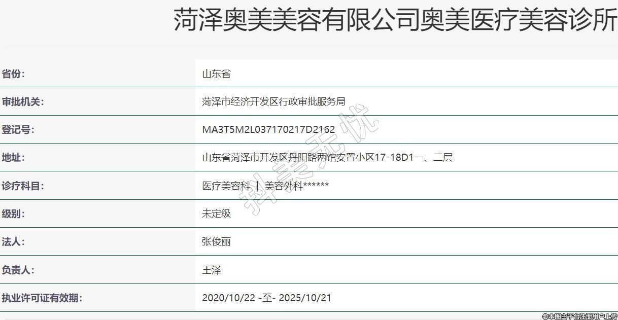 菏泽奥美医疗美容2020-05-28成立,地址:山东省菏泽市开发区丹阳路两馆安置小区17-18D1一、二层,诊疗科目:医疗美容科 | 美容外科******