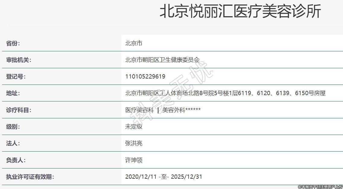北京悦丽汇医疗美容2014-09-10成立,地址:北京市朝阳区工人体育场北路8号院5号楼1层6119、6120、6139、6150号房屋,诊疗科目:医疗美容科 | 美容外科******