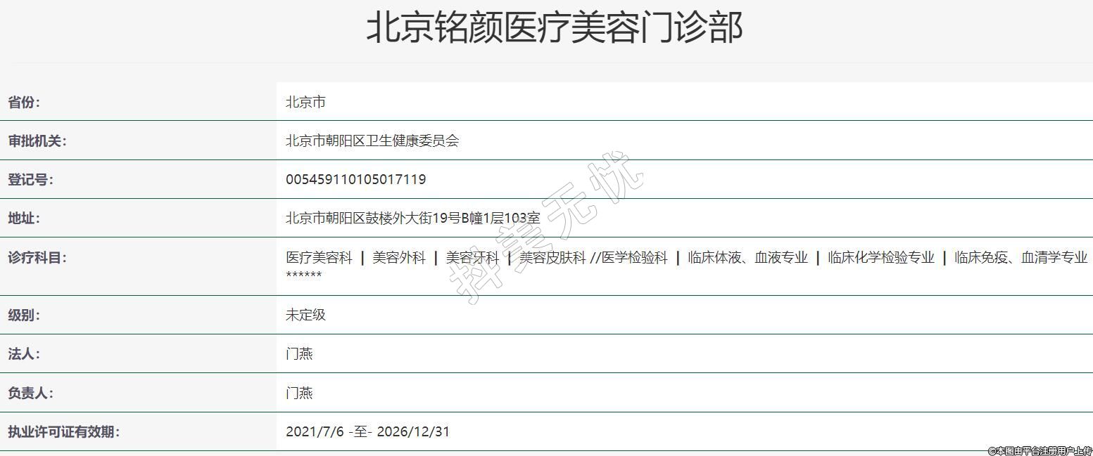 北京铭颜医疗美容2020-12-18成立,诊疗科目:医疗美容科 | 美容外科 | 美容牙科 | 美容皮肤科 //医学检验科 | 临床体液、血液专业 | 临床化学检验专业 | 临床免疫、血清学专业******