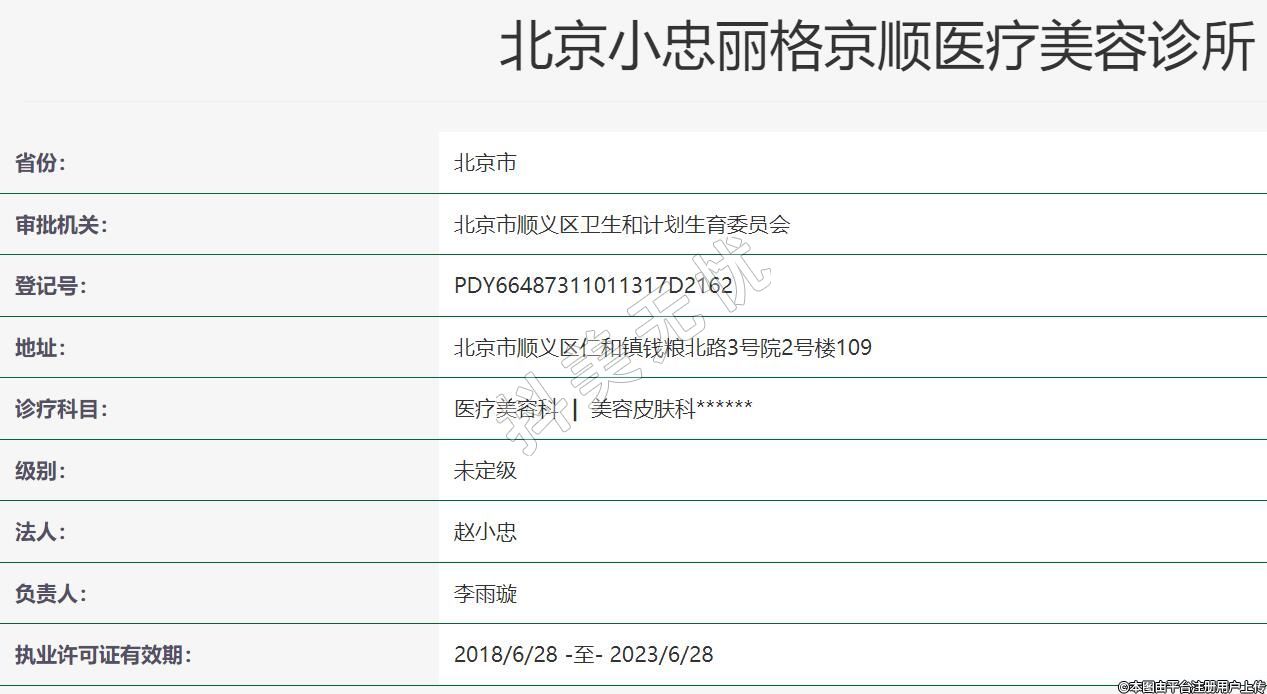 北京小忠丽格京顺医疗美容2017年09月01日成立,地址:北京市顺义区仁和镇钱粮北路3号院2号楼109,诊疗科目:医疗美容科 | 美容皮肤科******