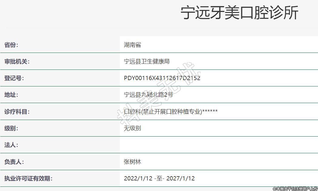永州牙美口腔2022年01月20日成立,地址:宁远县九疑北路2号,诊疗科目:口腔科(禁止开展口腔种植专业)******
