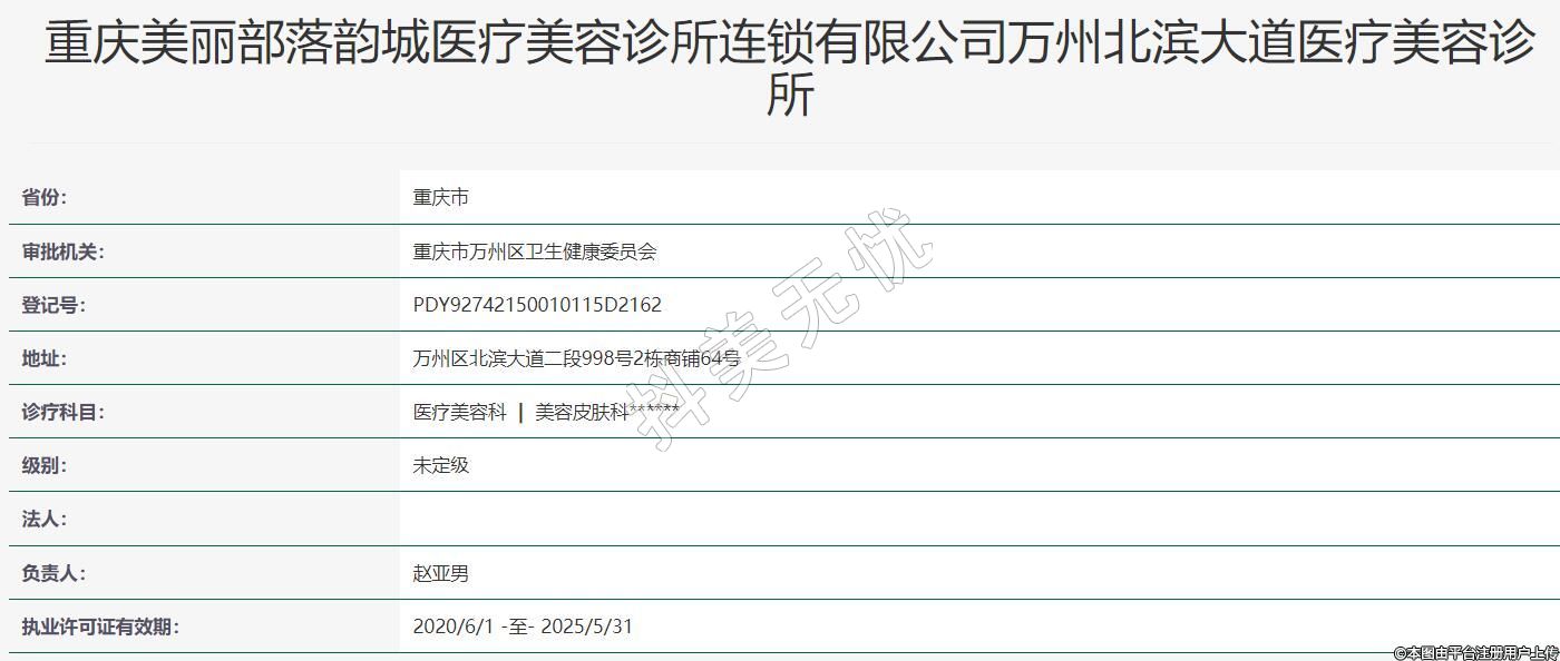 重庆美丽部落韵城医疗美容(万州)2019-08-19成立,地址:万州区北滨大道二段998号2栋商铺64号,诊疗科目:医疗美容科 | 美容皮肤科******