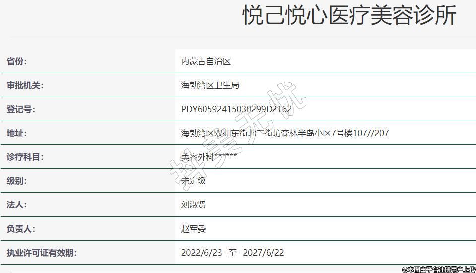 乌海市悦己悦心医疗美容有限公司,成立于2020-09-25,位于内蒙古自治区乌海市海勃湾区双拥东街北二街坊森林半岛小区7号楼107//207。