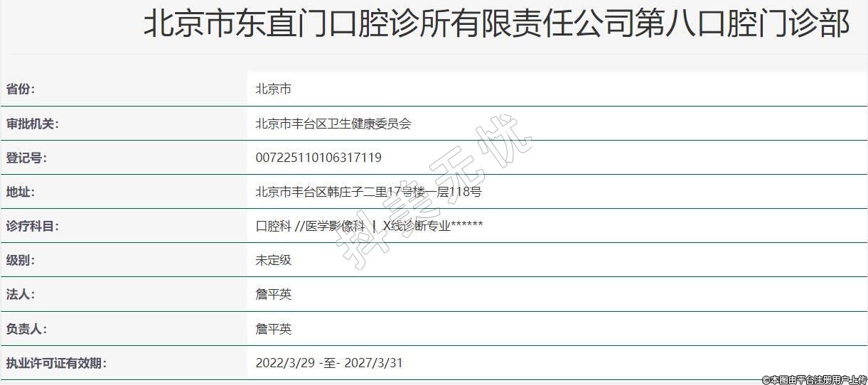 北京东直门口腔(第八口腔)2021-12-20成立,地址:北京市丰台区韩庄子二里17号楼一层118号,诊疗科目:口腔科 //医学影像科 | X线诊断专业******