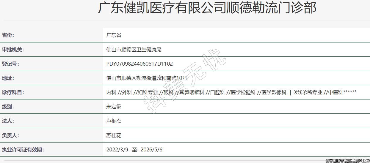 广东健凯医疗有限公司顺德勒流门诊部,成立于2020年,位于广东省佛山市,是一家以从事卫生为主的企业。