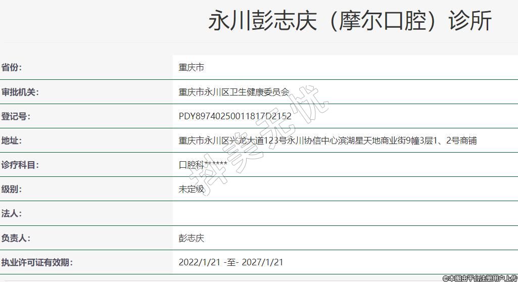 永川彭志庆摩尔口腔2017-06-16成立,地址:重庆市永川区兴龙大道123号永川协信中心滨湖星天地商业街9幢3层1、2号商铺,诊疗科目:口腔科******