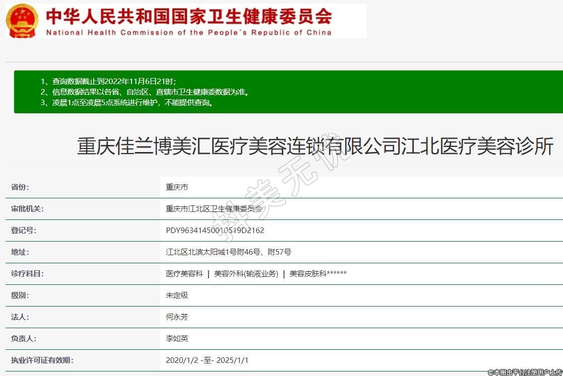重庆佳兰博美汇医疗美容(江北)2019-12-05成立,地址:江北区北滨太阳城1号附46号、附57号,诊疗科目:医疗美容科 | 美容外科(输液业务) | 美容皮肤科******
