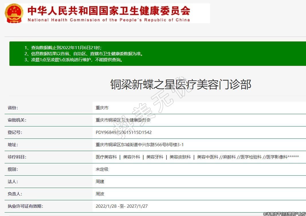 铜梁新蝶之星医疗美容2022-01-12成立,地址:重庆市铜梁区东城街道中兴东路566号8号楼3-1,诊疗科目:医疗美容科 | 美容外科 | 美容牙科 | 美容皮肤科 | 美容中医科 //麻醉科 //医学检验科 //医学影像科******