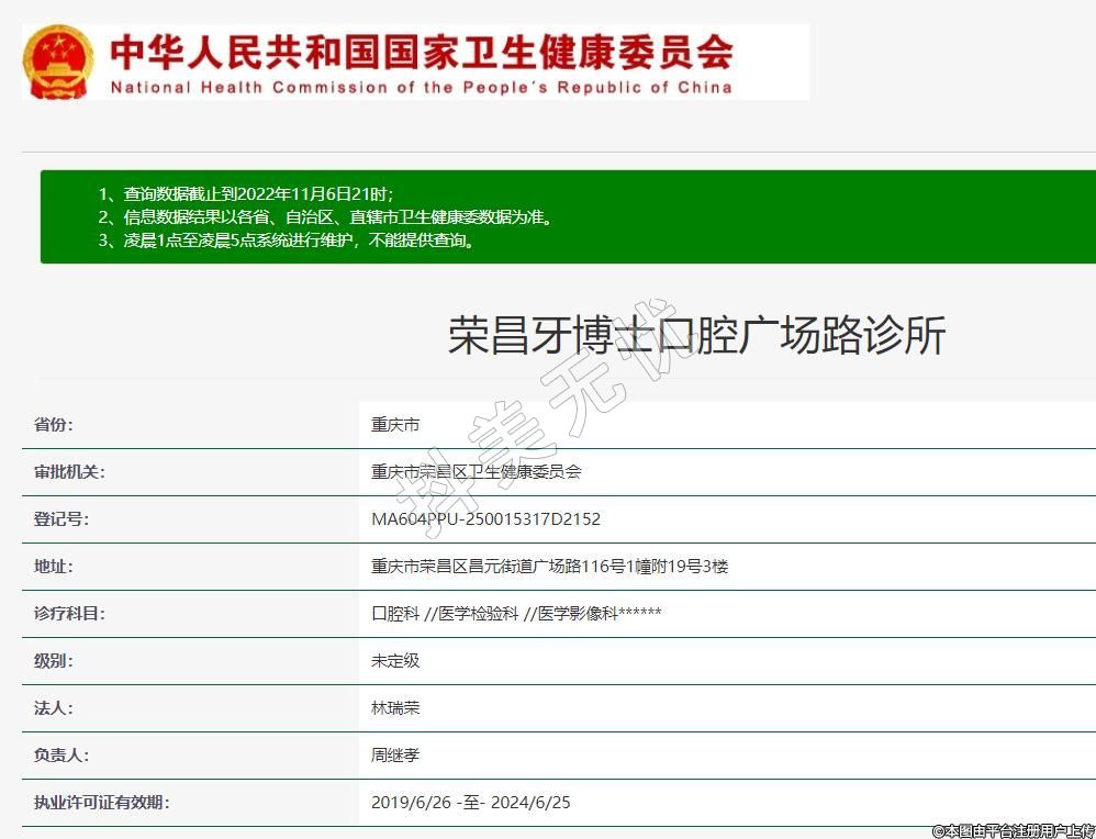荣昌牙博士口腔2018-10-24成立,地址:重庆市荣昌区昌元街道广场路116号1幢附19号3楼,诊疗科目:口腔科 //医学检验科 //医学影像科******
