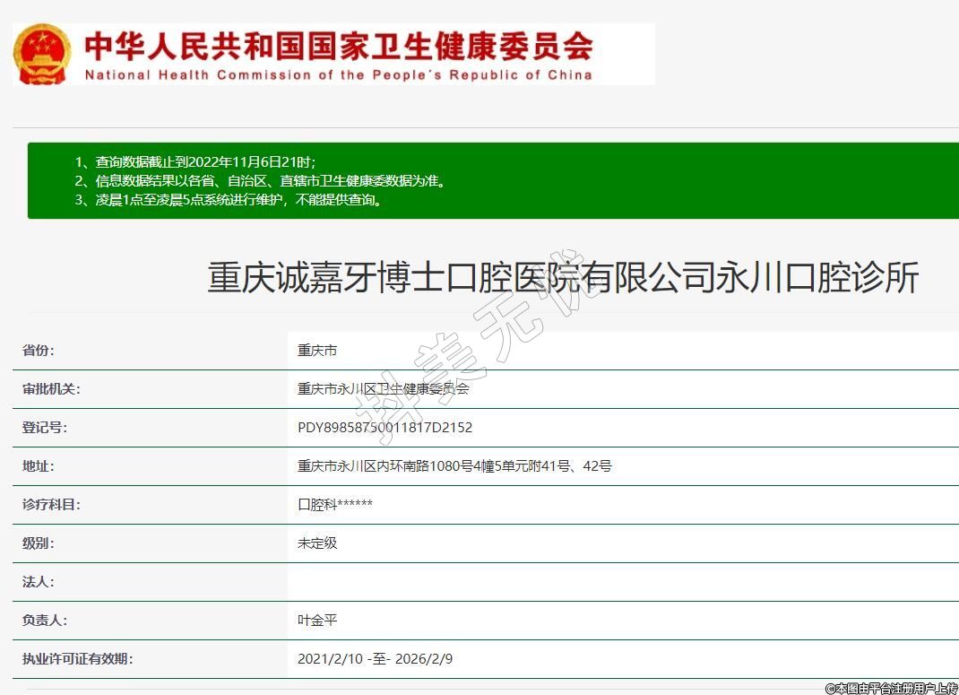 重庆诚嘉牙博士口腔(永川店)2020-11-19成立,地址:重庆市永川区内环南路1080号4幢5单元附41号、42号,诊疗科目:口腔科******