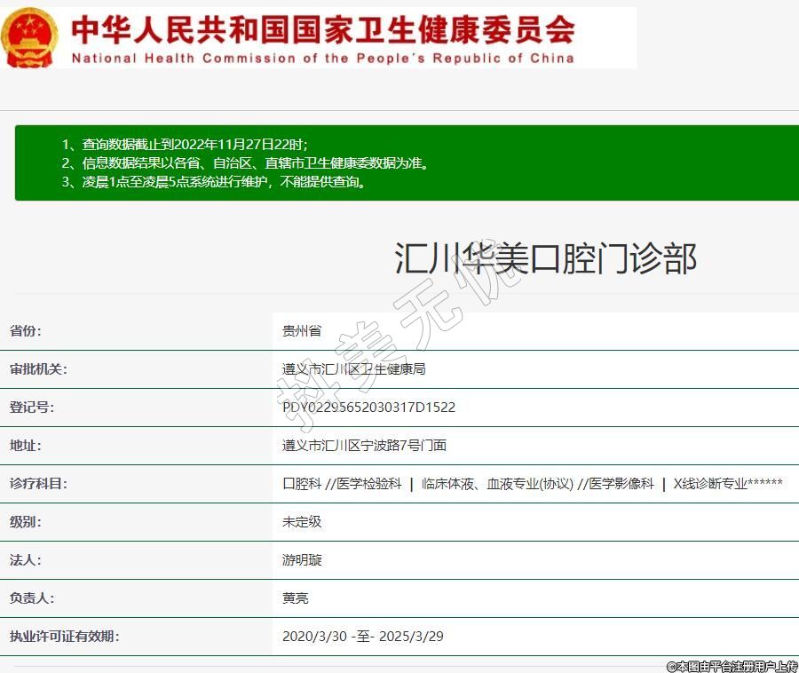 遵义华美口腔2012-04-16成立,地址:遵义市汇川区宁波路7号门面,诊疗科目:口腔科 //医学检验科 | 临床体液、血液专业(协议) //医学影像科 | X线诊断专业******