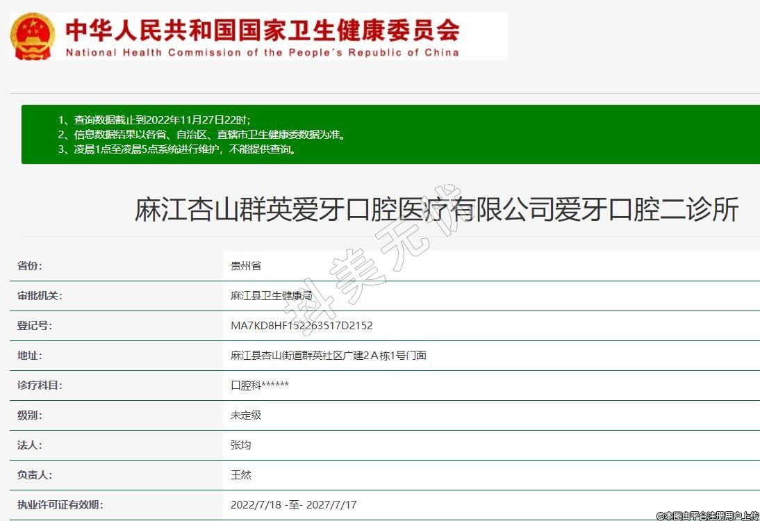 麻江杏山群英爱牙口腔医疗有限公司爱牙口腔二诊所2022-03-09成立,地址:麻江县杏山街道群英社区广建2A栋1号门面,诊疗科目:口腔科******