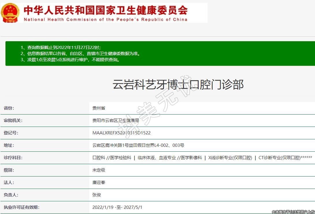 贵阳科艺牙博士口腔2021-09-07成立,诊疗科目:口腔科 //医学检验科 | 临床体液、血液专业 //医学影像科 | X线诊断专业(仅限口腔) | CT诊断专业(仅限口腔)******