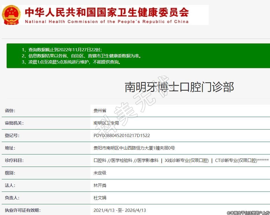 贵阳牙博士口腔(南明店)2020-11-18成立,地址:贵阳市南明区中山西路恒力大厦1幢夹层0号,诊疗科目:口腔科 //医学检验科 //医学影像科 | X线诊断专业(仅限口腔) | CT诊断专业(仅限口腔)******