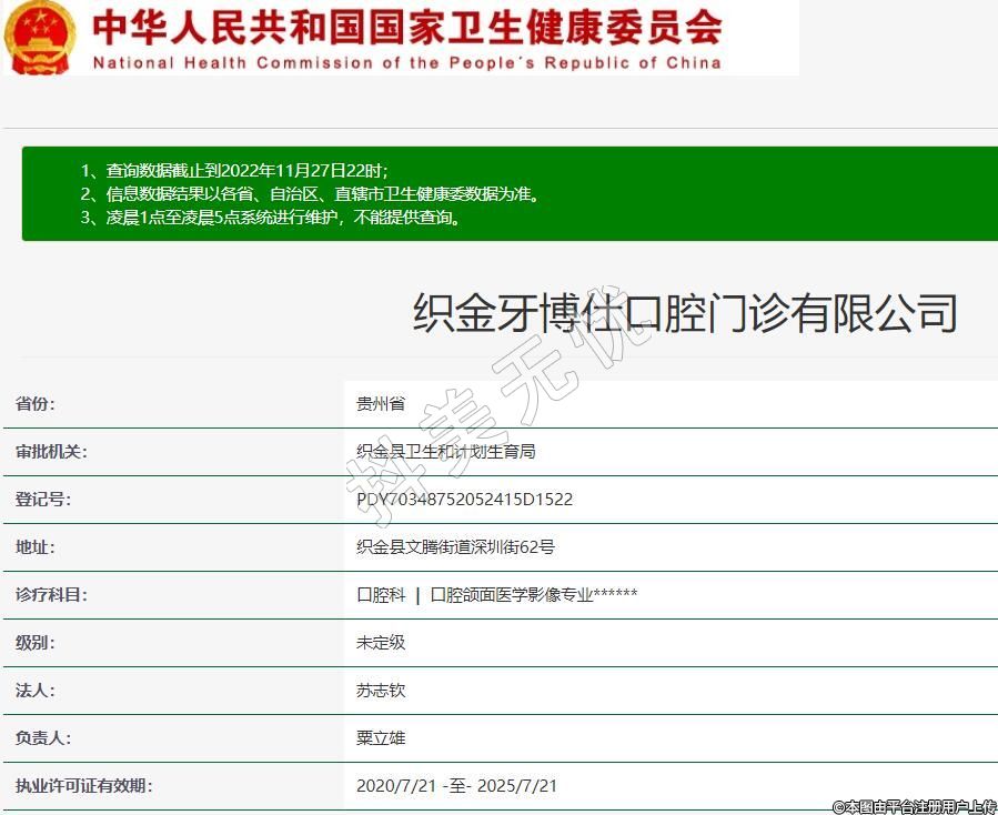 织金牙博仕口腔2020-06-04成立,地址:织金县文腾街道深圳街62号,诊疗科目:口腔科 | 口腔颌面医学影像专业******