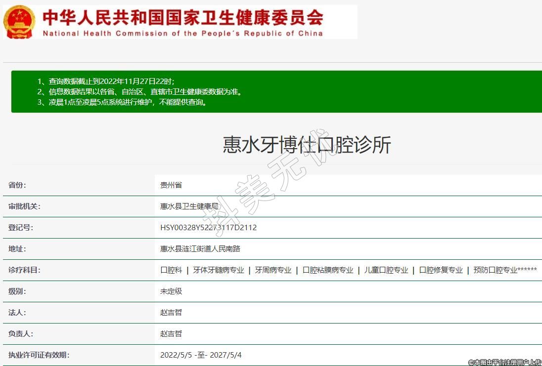 惠水牙博仕口腔2019-12-20成立,诊疗科目:口腔科 | 牙体牙髓病专业 | 牙周病专业 | 口腔粘膜病专业 | 儿童口腔专业 | 口腔修复专业 | 预防口腔专业******