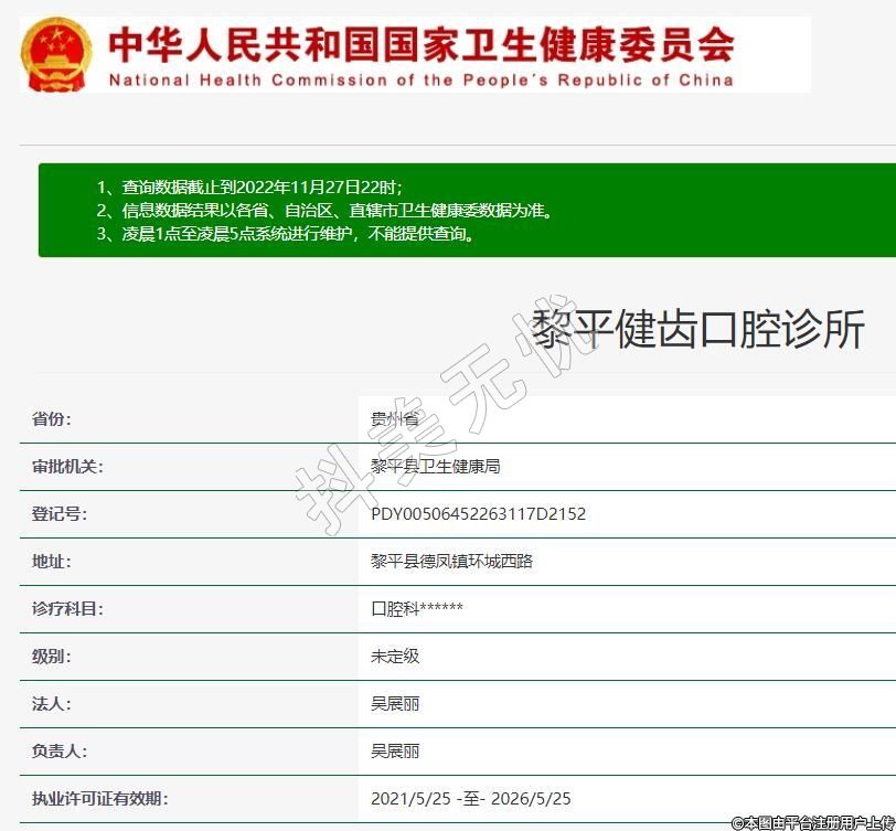 黎平健齿口腔2010-11-18成立,诊疗科目:口腔科******