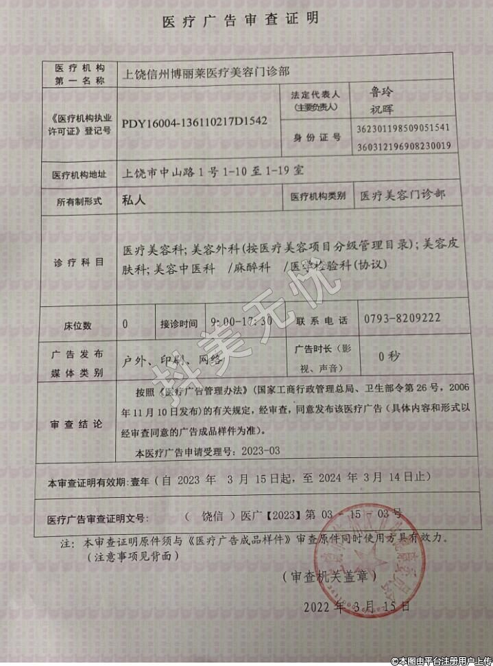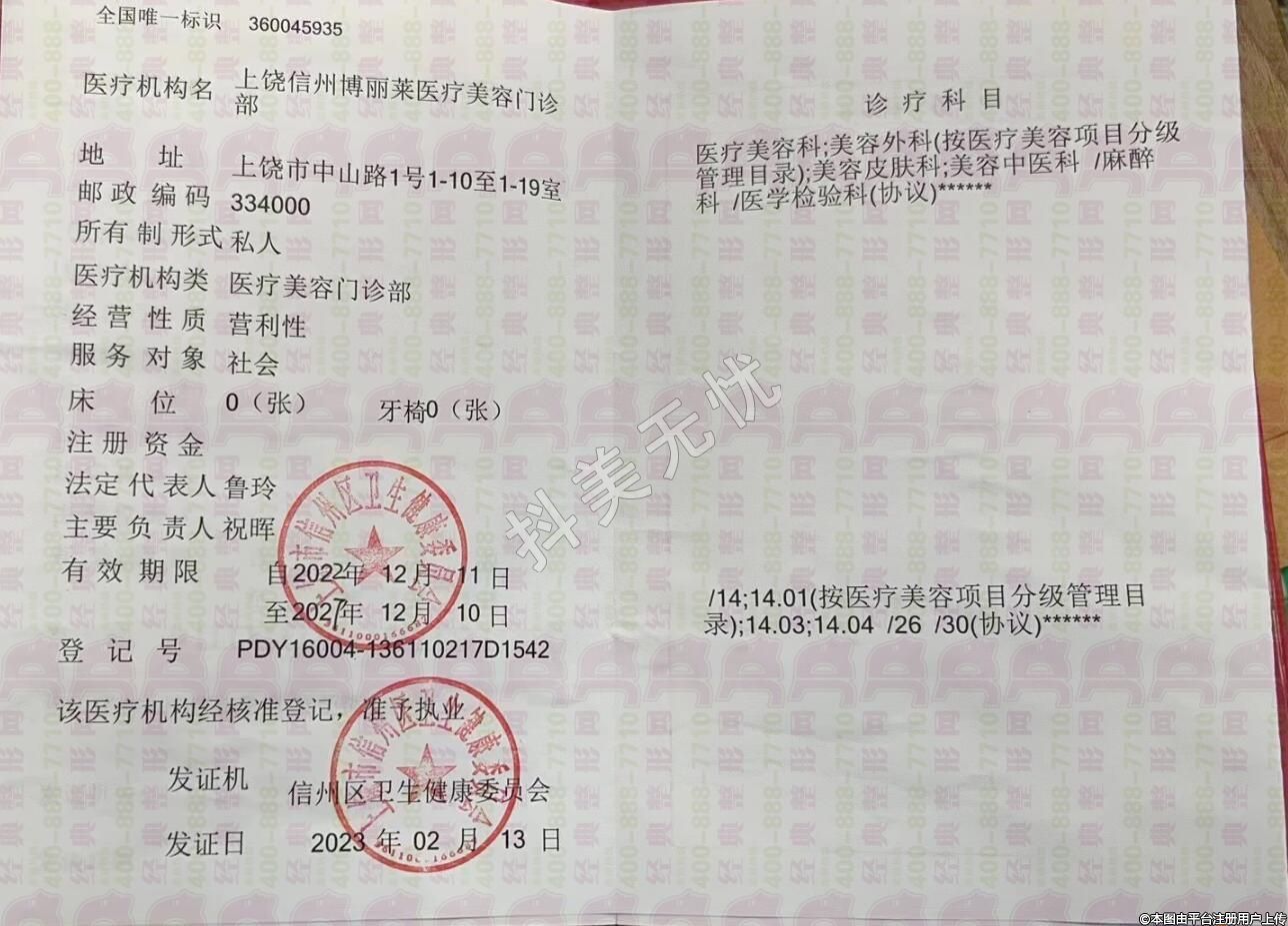 医疗机构名:上饶信州博丽莱医疗美容门诊部