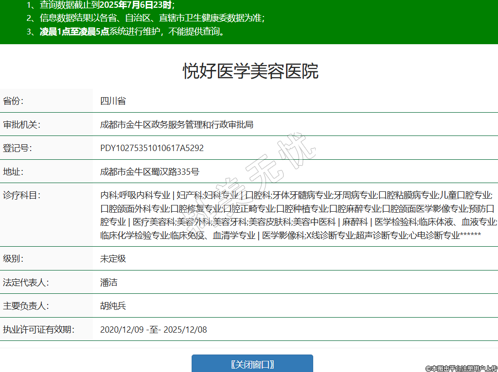 省份:四川省审批机关:成都市金牛区政务服务管理和行政审批局登记号:PDY10275351010617A5292地址:成都市金牛区蜀汉路335号诊疗科目:内科;呼吸内科专业 | 妇产科;妇科专业 | 口腔科;牙体牙髓病专业;牙周病专业;口腔粘膜病专业;儿童口腔专业;口腔颌面外科专业;口腔修复专业;口腔正畸专业;口腔种植专业;口腔麻醉专业;口腔颌面医学影像专业;预防口腔专业 | 医疗美容科;美容外科;美容牙科;美容皮肤科;美容中医科 | 麻醉科 | 医学检验科;临床体液、血液专业;临床化学检验专业;临床免疫、血清学专业 | 医学影像科;X线诊断专业;超声诊断专业;心电诊断专业******级别:未定级法定代表人:潘洁主要负责人:胡纯兵执业许可证有效期:2020/12/09 -至- 2025/12/08 -