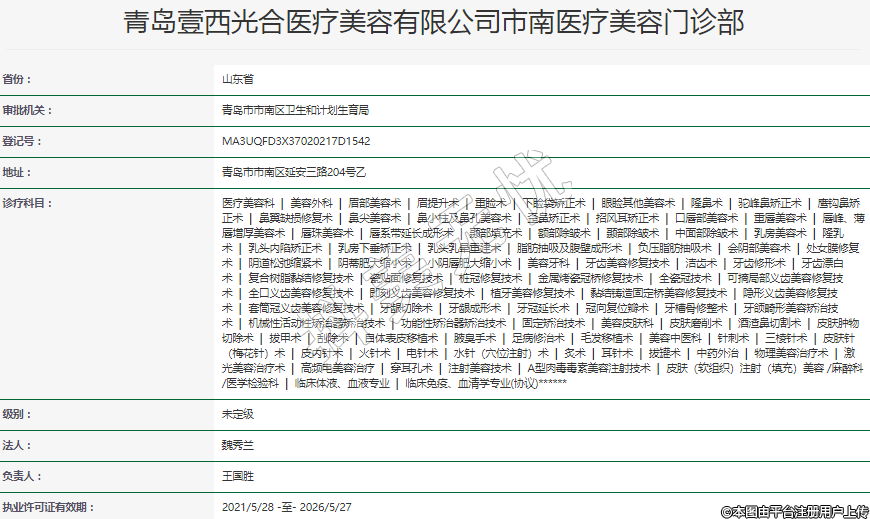 青岛壹西光合医疗美容有限公司市南医疗美容门诊部