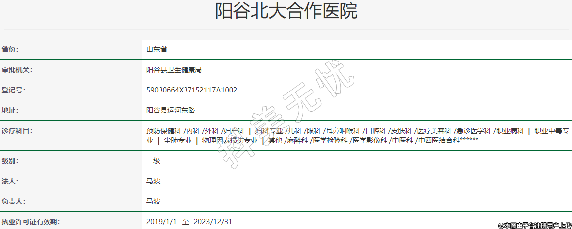 阳谷北大合作医院成立于2020年,统一社会信用代码:91371521MA3RLKLH9H,坐落于聊城市阳谷县城中心运河东路水利局西邻一家综合医院。
