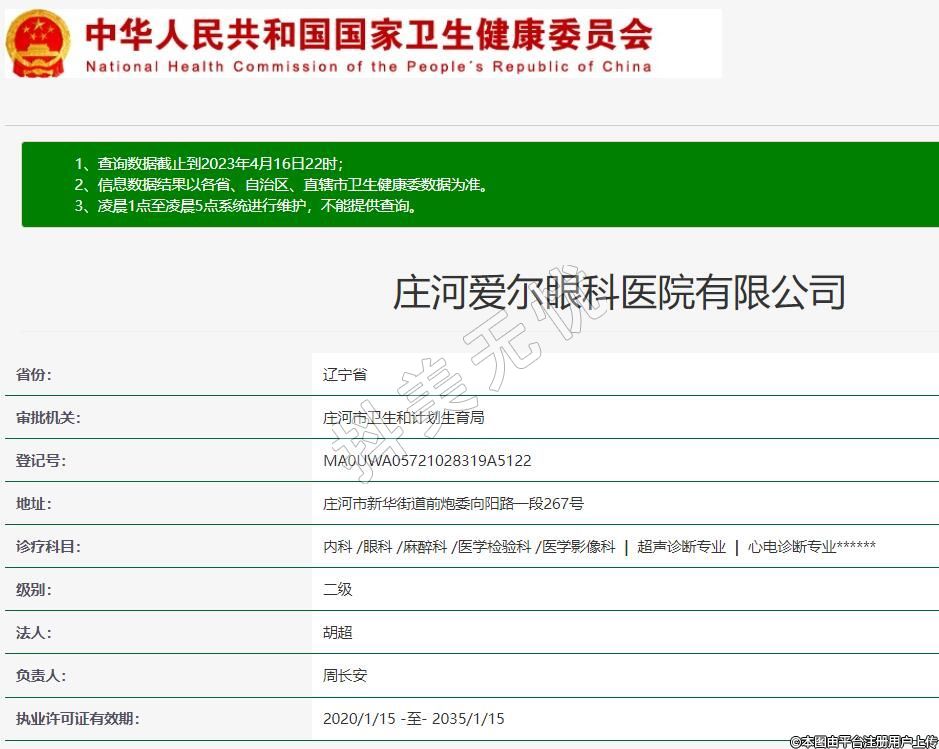 庄河爱尔眼科医院有限公司,诊疗科目:内科 /眼科 /麻醉科 /医学检验科 /医学影像科 | 超声诊断专业 | 心电诊断专业******