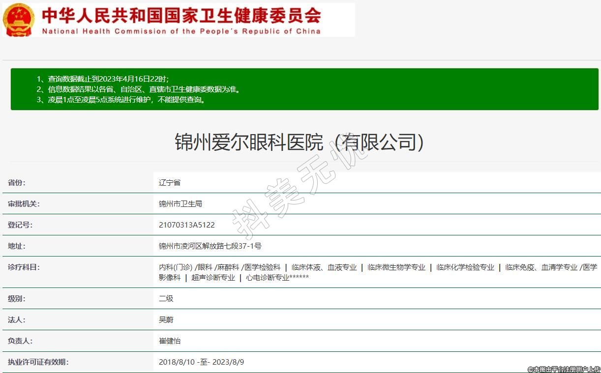 锦州爱尔眼科医院(有限公司)诊疗科目:内科(门诊) /眼科 /麻醉科 /医学检验科 | 临床体液、血液专业 | 临床微生物学专业 | 临床化学检验专业 | 临床免疫、血清学专业 /医学影像科 | 超声诊断专业 | 心电诊断专业******
