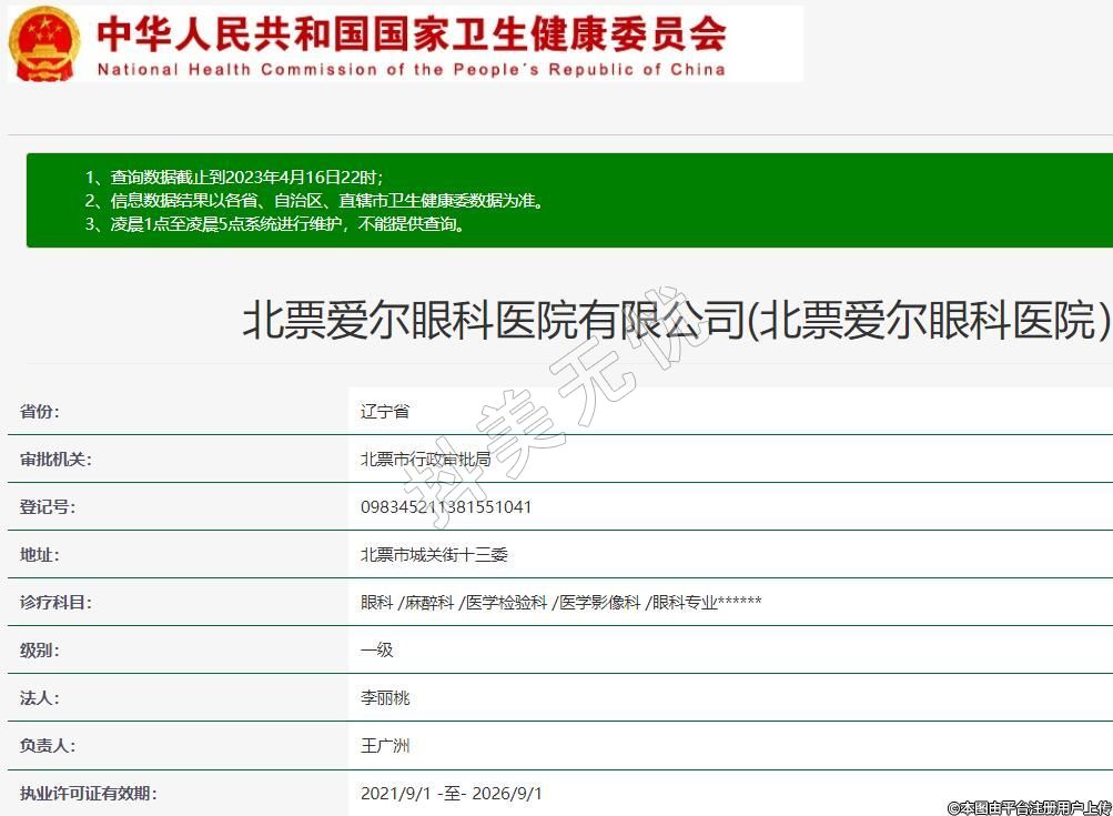 北票爱尔眼科医院有限公司(北票爱尔眼科医院)诊疗科目:眼科 /麻醉科 /医学检验科 /医学影像科 /眼科专业******