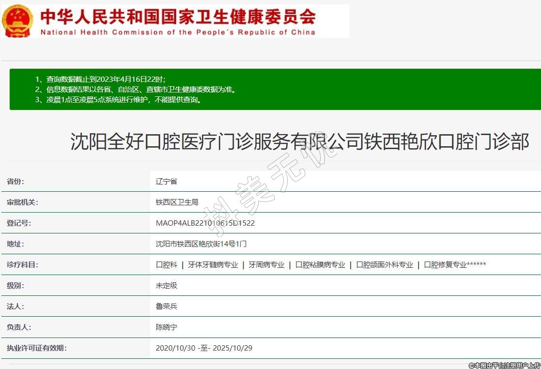 沈阳全好口腔医疗门诊服务有限公司铁西艳欣口腔门诊部,诊疗科目:口腔科 | 牙体牙髓病专业 | 牙周病专业 | 口腔粘膜病专业 | 口腔颌面外科专业 | 口腔修复专业******