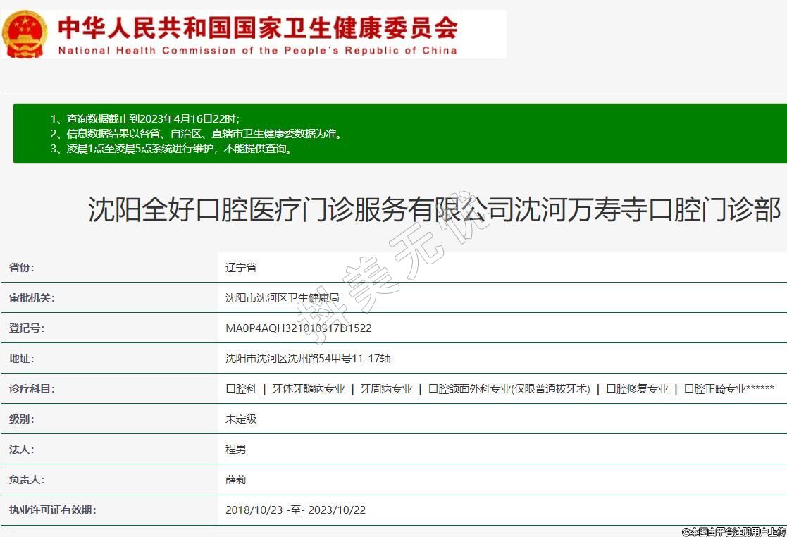 沈阳全好口腔医疗门诊服务有限公司沈河万寿寺口腔门诊部,诊疗科目:口腔科 | 牙体牙髓病专业 | 牙周病专业 | 口腔颌面外科专业(仅限普通拔牙术) | 口腔修复专业 | 口腔正畸专业******
