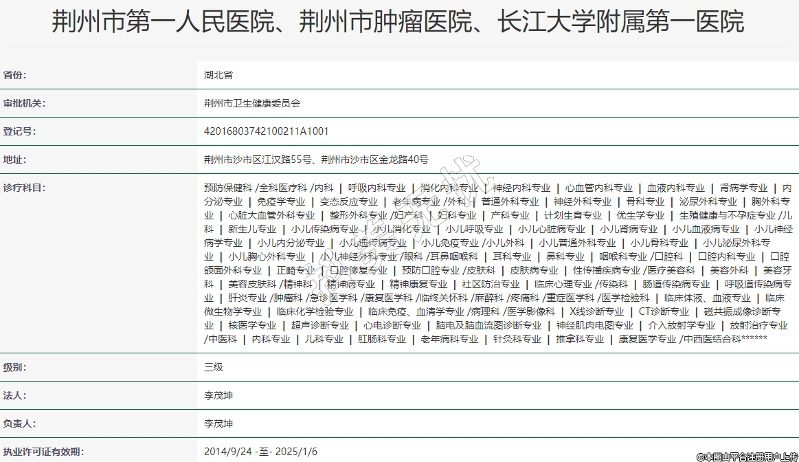 荆州市第一人民医院、荆州市肿瘤医院、长江大学附属第一医院