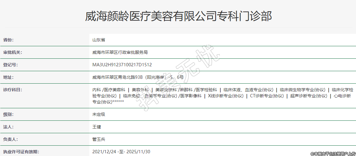 威海颜龄医疗美容有限公司专科门诊部