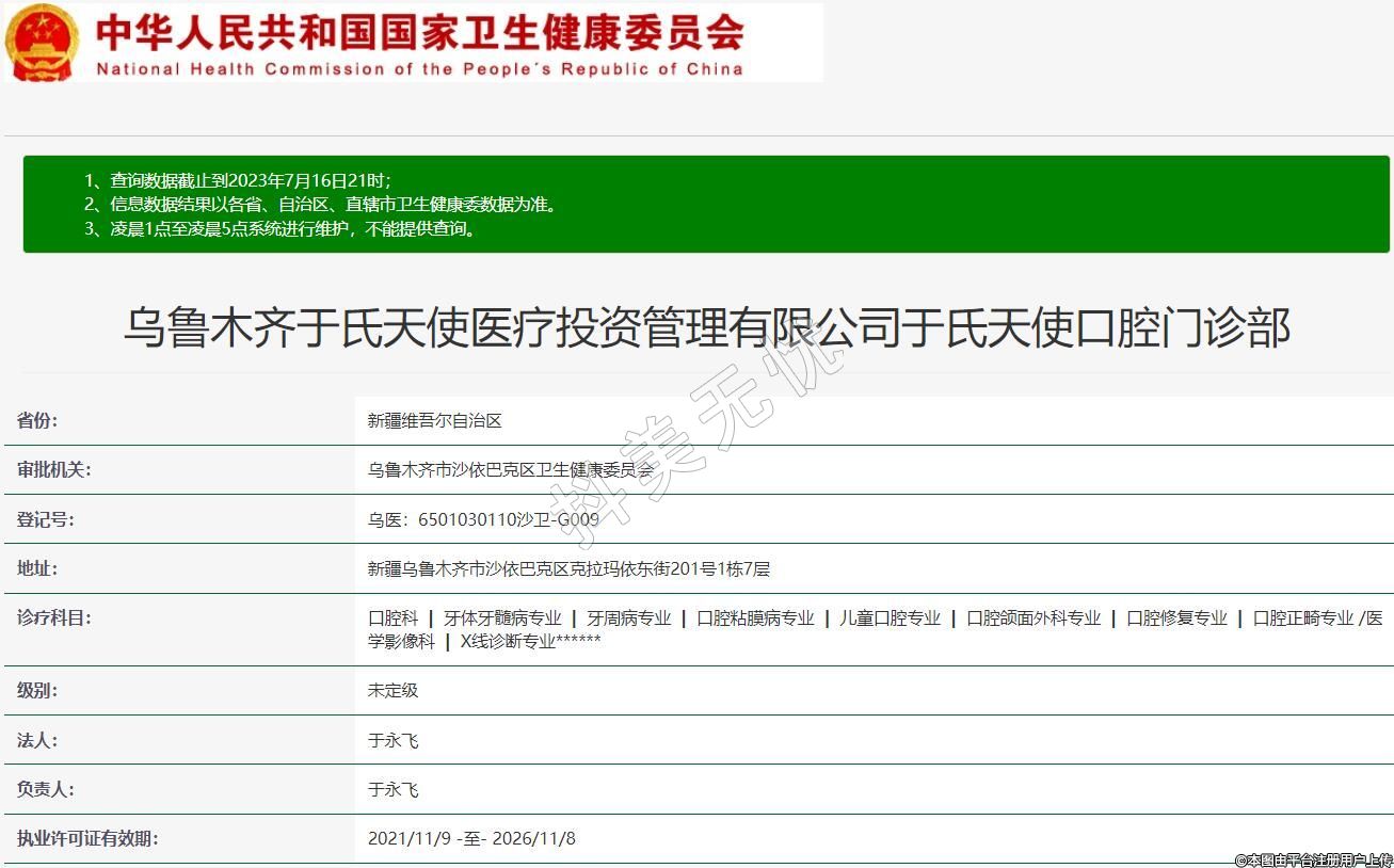 乌鲁木齐于氏天使医疗投资管理有限公司于氏天使口腔门诊部