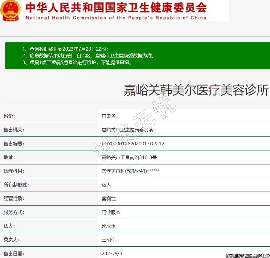 嘉峪关韩美尔医疗美容,诊疗科目:医疗美容科(整形外科)******
