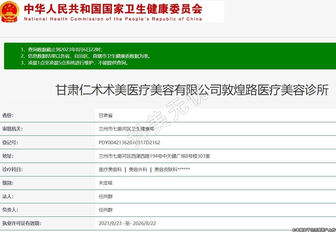 兰州仁术术美医疗美容诊所创立于2021年,统一社会信用代码:91620103MA743HFQ4R,位于甘肃省兰州市七里河区西津西路194号中天健8号楼303室,一直秉承“吉祥安康,以诚待人”的企业使命宣言,始终贯彻“耐心解答、细心诊断、精心治疗、热心服务”的服务理念,坚持“顾客的需求就是我们努力的方向”,始于顾客需求,忠于顾客满意,顾客的满意是我们全体工作人员工作的标准。