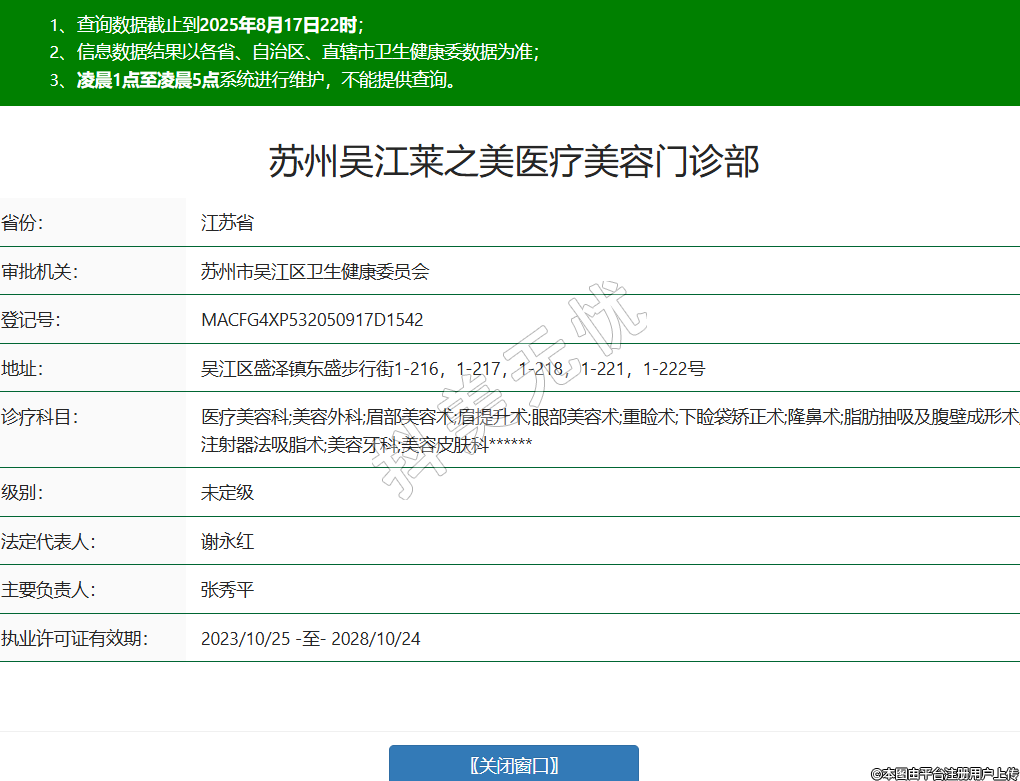 省份:江苏省审批机关:苏州市吴江区卫生健康委员会登记号:MACFG4XP532050917D1542地址:吴江区盛泽镇东盛步行街1-216,1-217,1-218,1-221,1-222号诊疗科目:医疗美容科;美容外科;眉部美容术;眉提升术;眼部美容术;重睑术;下睑袋矫正术;隆鼻术;脂肪抽吸及腹壁成形术;注射器法吸脂术;美容牙科;美容皮肤科******级别:未定级法定代表人:谢永红主要负责人:张秀平执业许可证有效期:2023/10/25 -至- 2028/10/24 -