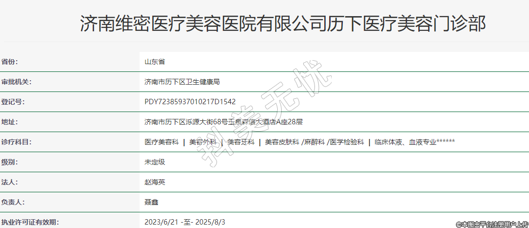 济南维密医疗美容门诊部成立于2020年,位于济南市历下区泺源大街68号玉泉森信大酒店A座29层,是一家集整形美容、注射美容、皮肤美容和微整形于一体的整形医疗机构。
