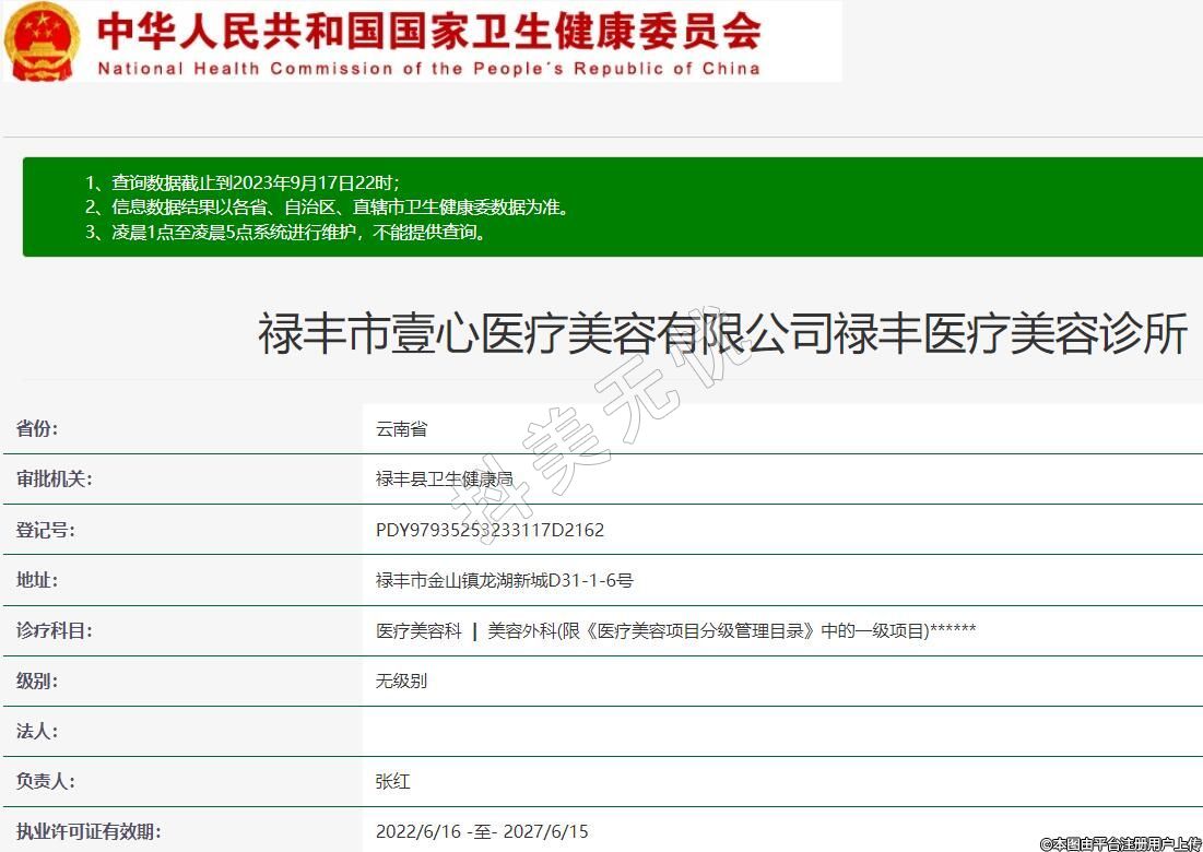 禄丰市壹心医疗美容有限公司禄丰医疗美容诊所,诊疗科目:医疗美容科 | 美容外科(限《医疗美容项目分级管理目录》中的一级项目)******
