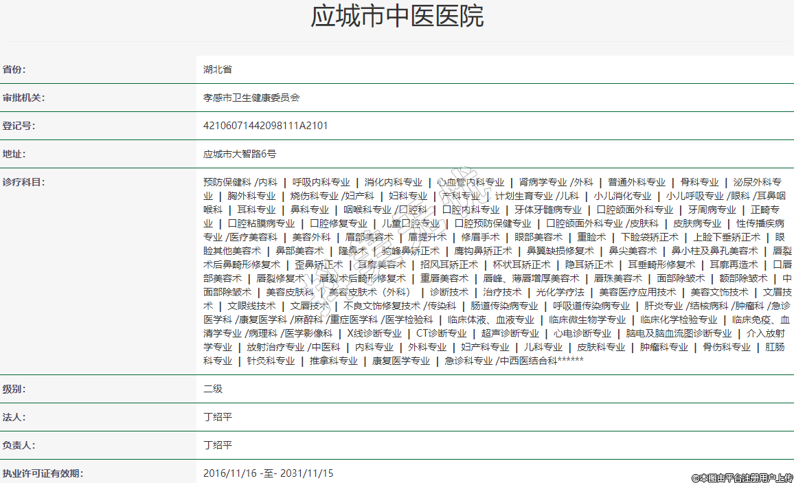 诊疗科目:预防保健科 /内科 | 呼吸内科专业 | 消化内科专业 | 心血管内科专业 | 肾病学专业 /外科 | 普通外科专业 | 骨科专业 | 泌尿外科专业 | 胸外科专业 | 烧伤科专业 /妇产科 | 妇科专业 | 产科专业 | 计划生育专业 /儿科 | 小儿消化专业 | 小儿呼吸专业 /眼科 /耳鼻咽喉科 | 耳科专业 | 鼻科专业 | 咽喉科专业 /口腔科 | 口腔内科专业 | 牙体牙髓病专业 | 口腔颌面外科专业 | 牙周病专业 | 正畸专业 | 口腔粘膜病专业 | 口腔修复专业 | 儿童口腔专业 | 口腔预防保健专业 | 口腔颌面外科专业 /皮肤科 | 皮肤病专业 | 性传播疾病专业 /医疗美容科 | 美容外科 | 眉部美容术 | 眉提升术 | 修眉手术 | 眼部美容术 | 重睑术 | 下睑袋矫正术 | 上睑下垂矫正术 | 眼睑其他美容术 | 鼻部美容术 | 隆鼻术 | 驼峰鼻矫正术 | 鹰钩鼻矫正术 | 鼻翼缺损修复术 | 鼻尖美容术 | 鼻小柱及鼻孔美容术 | 唇裂术后鼻畸形修复术 | 歪鼻矫正术 | 耳廓美容术 | 招风耳矫正术 | 杯状耳矫正术 | 隐耳矫正术 | 耳垂畸形修复术 | 耳廓再造术 | 口唇部美容术 | 唇裂修复术 | 唇裂术后畸形修复术 | 重唇美容术 | 唇峰、薄唇增厚美容术 | 唇珠美容术 | 面部除皱术 | 额部除皱术 | 中面部除皱术 | 美容皮肤科 | 美容皮肤术(外科) | 诊断技术 | 治疗技术 | 光化学疗法 | 美容医疗应用技术 | 美容文饰技术 | 文眉技术 | 文眼线技术 | 文唇技术 | 不良文饰修复技术 /传染科 | 肠道传染病专业 | 呼吸道传染病专业 | 肝炎专业 /结核病科 /肿瘤科 /急诊医学科 /康复医学科 /麻醉科 /重症医学科 /医学检验科 | 临床体液、血液专业 | 临床微生物学专业 | 临床化学检验专业 | 临床免疫、血清学专业 /病理科 /医学影像科 | X线诊断专业 | CT诊断专业 | 超声诊断专业 | 心电诊断专业 | 脑电及脑血流图诊断专业 | 介入放射学专业 | 放射治疗专业 /中医科 | 内科专业 | 外科专业 | 妇产科专业 | 儿科专业 | 皮肤科专业 | 肿瘤科专业 | 骨伤科专业 | 肛肠科专业 | 针灸科专业 | 推拿科专业 | 康复医学专业 | 急诊科专业 /中西医结合科******