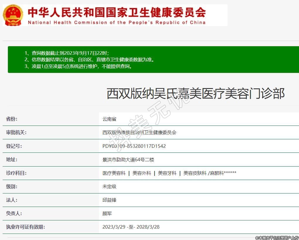 西双版纳吴氏嘉美医疗美容门诊部,诊疗科目:医疗美容科 | 美容外科 | 美容牙科 | 美容皮肤科 /麻醉科******